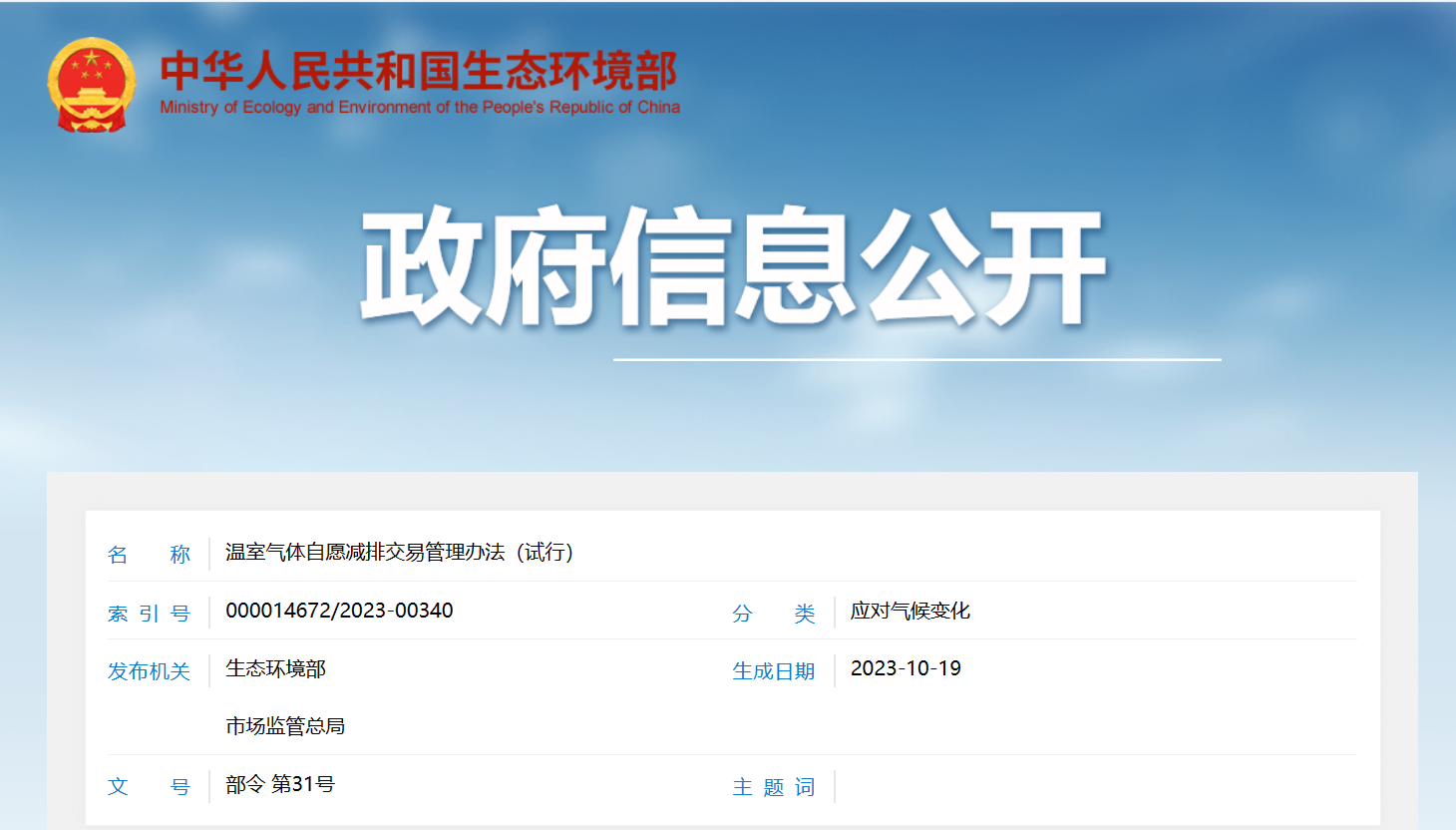 10月20日晚,生態(tài)環(huán)境部正式公布《溫室氣體自愿減排交易管理辦法(試行)》,標(biāo)志國家核證自愿減排量(CCER)正式重啟。CCER在2012年上線,又在2017年被暫停交易,至今已有6年。據(jù)悉,此前CCER雖被暫停,但市場上已備案的存量CCER仍可參與交易。從今年年初開始,CCER重啟呼聲越來越高。2023年6月,生態(tài)環(huán)境部表示力爭CCER年內(nèi)重啟,并完成全國溫室氣體自愿減排注冊登記系統(tǒng)、交易系統(tǒng)完查看更多>> -