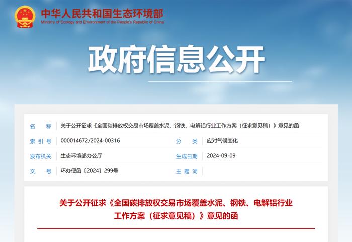 生態(tài)環(huán)境部:《全國碳排放權(quán)交易市場覆蓋水泥、鋼鐵、電解鋁行業(yè)工作方案(征求意見稿)》